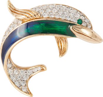 A perfect little treasure. 22ct gold plated dolphin brooch. Features blue and green enamel embellished with clear round-cut Swarovski crystals. Closes with safety clasp closure. Signed A&S for Attwood & Sawyer.