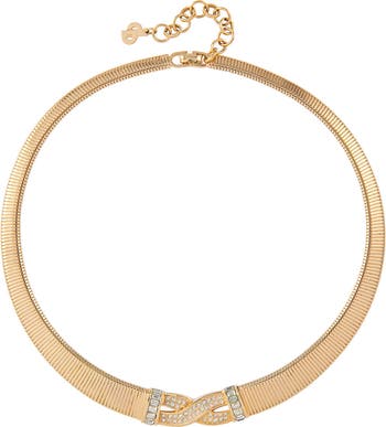 A subtly sparkling piece from Dior. This gold plated flex chain necklace features a central cross over design embellished with round-cut clear Swarovski crystals. It closes with fold-over clasp and extension chain. Signed Christian Dior.