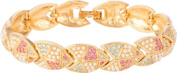 The prettiest of pastels. This 22ct triple gold plated articulated bracelet is embellished with pastel blue and pink Swarovski crystals complimented with luminous faux pearls. Closes with a fold-over clasp and safety chain.