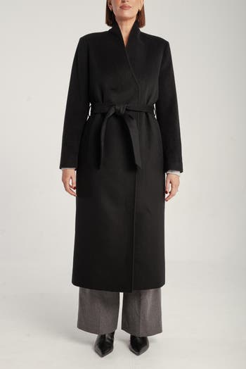 Elegant cashmere drapes into a structured belted silhouette, offering warmth, sculptural shape, and an office to evening presence.