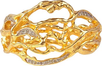 Glamour, style and unparalleled luxury. 22ct gold plated vine cuff. Encrusted with rows of round-cut Swarovski crystals. Hinged with a hidden pinch push clasp, signed Elizabeth Taylor.