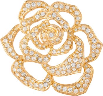 Classic style and making a statement. 22ct gold plated sculpted brooch. Exquisite open work floral rose design embellished with round-cut clear Swarovski crystals. Signed Elizabeth Taylor.