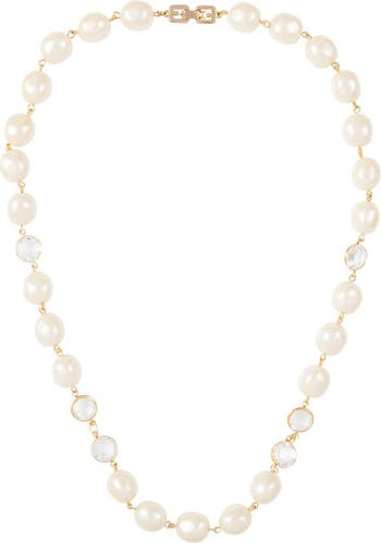 Classic elegance. Gold plated faux pearl and Swarovski crystal necklace, inspired by regal elegance. Features luminous baroque shaped faux pearls and circular faceted Swarovski crystal beads. Closes with Givenchy logo fold-over clasp, signed Givenchy.