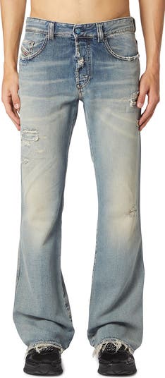 Strategic rips and deep fading bring a time-worn look to these slouchy bootcut jeans made from nonstretch denim.