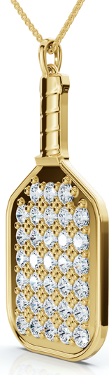 Show your love for the fastest-growing sport with the dazzling Diamond Studded Pickleball Paddle Pendant Necklace. This fun and fashionable pendant features a meticulously crafted pickleball paddle design, with its entire 'sweet spot' brilliantly studded with numerous pave-set lab-grown diamonds. The sparkling diamonds catch the light with every move, making this a standout piece. Crafted in polished 10k gold, this unique necklace is the perfect accessory for the pickleball enthusiast or a thoughtful gift for a loved one who enjoys the game.