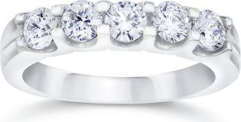 This classic ladies anniversary wedding ring features 5 round brilliant cut diamonds. All diamonds are prong set in solid 10k white gold. 1ct total diamond weight.