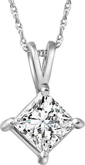 This classic women's solitaire pendant features one princess square cut lab grown diamond. The diamond is prong set in solid white gold. An 18" 14k white gold clasp lock chain is included.