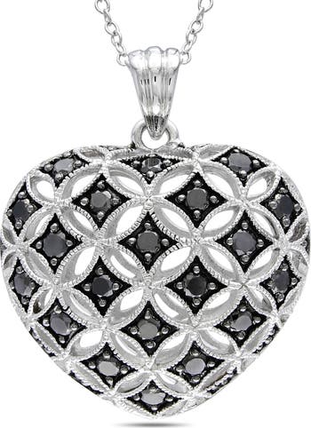 This classic heart necklace gets added style with a basket weaving detailing and black diamond accents. Crafted in sterling silver