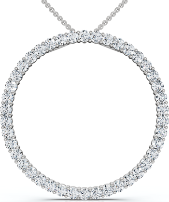 This circle eternity pendant features round brilliant cut lab grown diamonds. All diamonds are prong set in solid silver. An 18" chain is included. Pendant is 1 inch tall.