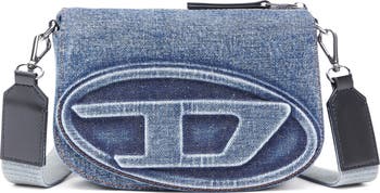 The label's sleek logo is enlarged to bold proportions on a structured denim bag suspended from an adjustable webbing strap for convenient carry.