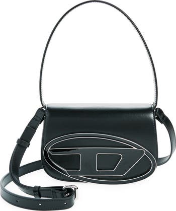 The label's sleek logo hardware is enlarged to bold proportions on a streamlined handbag crafted from leather with a top carry handle and removable strap.