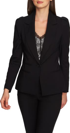 A single-button blazer cut from structured double-weave fabric lets your feminine side shine with perfectly pleated puff shoulders and a sharp, darted waist.