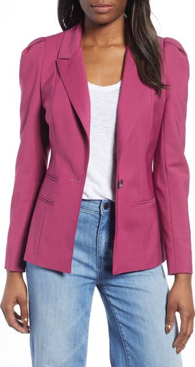 A single-button blazer cut from structured double-weave fabric lets your feminine side shine with perfectly pleated puff shoulders and a sharp, darted waist.