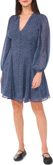 Voluminous blouson sleeves frame this V-neck chiffon dress that has cloth-wrapped buttons on the bodice for a vintage-inspired look.