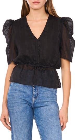 Puffed shoulders and tonal stripes further the everyday sophistication of this cotton-and-silk peplum shirt.