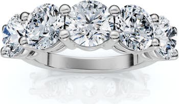 women's ring features 5 round brilliant cut lab grown diamonds set in solid 14k white gold. All diamonds are common prong set in classic traditional high polished band.