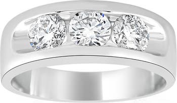 High quality mens ring features three round brilliant cut genuine lab grown diamonds. The diamonds are channel set in solid 10k white gold. The band has a rounded smooth high polish finish.