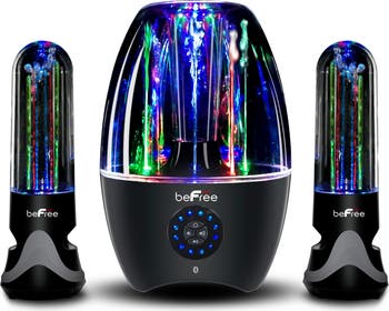 Let beFree Sound's 2.1 Channel Wireless Multimedia LED Dancing Water Bluetooth Sound System whisk you away with the hypnotizing motion of dancing water and striking bright lights. This multimedia system is ideal for entertaining your guests and bringing more excitement and appeal to any event. This unit is more than just an amazing party speaker system. While this multimedia system is wonderful for entertaining guests, it is also the ideal companion for rest and relaxation. The reactive lights and dancing water streams will lull you into a peaceful state of mind. Item includes: 1 sub-woofer and 2 satellite water speakers Item measures: Subwoofer: 8.5" Width, 12.5" Height, 4.5 lb. Weight Satellite Speakers: 3.5" Width, 10.5" Height. 1.0 lb. Weight Item Dimensions: 13.50" x 10.50" x 7.50" Item Weight: 6.70lbs