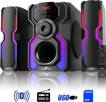 The Hot New beFree Sound 2.1 Channel Multimedia Wired Speaker Shelf System with Sound Reactive LED lights and USB Input offer you and your home an elevated audio experience. With strong, clear and vibrant sound quality this wired shelf system will bring a smile to your face while filling your home or office with the sounds of your favorite tracks. The integrated LED lighting element adds a subtle allure that enhances your visual and audible experience. Alternating light patterns will move along with the sounds of the music to delight your senses and add a special touch to the songs you know and love. This unit comes with a handy remote control for your ease and convenience, and will be a wonderful addition to your favorite musical space. It also makes a stunning gift for your coworkers, family and friends. But should you choose to enjoy your new sound system in the privacy of your own home, you will be delighted with the intimate yet vibrant alternating LED lights, the smooth and clear sound and the modern sleek design of this brand new system. The system includes a main unit sub-woofer with LED lights, as well as 2 LED Lit wired shelf speakers which may be angled to convey the sound to each corner of your musical enjoyment space of choice. Speakers: 6.5" Subwoofer /3" Satellite Speakers (2) Output Power : 80W (50W + 15W x 2) Frequency Response : 40Hz-20Khz Impedance: 6 ohm (Subwoofer)/4 ohm (Speakers) S/N Ratio : ≥50dB Separation : ≥75dB Sensitivity :88±3dB Power : 110V, 60 Hz Material : ABS Color : Black & Silver Modes: AUX, BT, FM Radio,USB, SD Accessories: Remote Control (AA batteries not included), Power Adapter, 3.5 mm Audio Cable, LED Speaker Cables LED Satellite Speakers Subwoofer Dimensions : 14.5" x 12.2" x 9.2" Satellite Speakers Dimensions : 14.5" x 3.9" x 3.1" Item Dimensions: 14.50" x 12.20" x 9.25" Item Weight: 17.05lbs