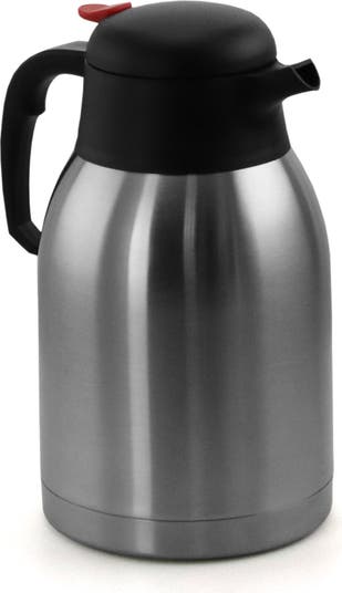 Keep your drinks hot with MegaChef 2.11 Quart Stainless Steel Thermal Beverage Carafe for Coffee and Tea. This versatile and convenient hot beverage carafe is a great tool to have on hand for all gatherings and events. This thermos is equipped with stainless steel insulation, ensuring beverages stay at their desired temperature for hours. The thermos is also equipped with an easy to pour dispenser that can securely be opened and closed using the single touch red safety latch near the handle, securing the hot liquids and minimizing spills. Thermos' screw off top can be opened with ease and stays on securely. The thermos also comes with a 4.5" non-burn handle attached for easy transportation. Ideal for all types of gatherings such as events, meetings, tailgates, barbecues, birthdays, and fundraisers.