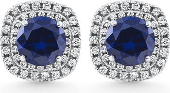 Matching pair of high quality womens earrings features two round brilliant cut created blue sapphires and round cut lab grown diamonds. All diamonds and gemstones are prong set in solid 14k white gold with medium weight secure push backs.