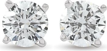 This classic matching pair of studs features 2 round brilliant cut moissanite stones. Both stones are prong set in solid 14k white gold findings. Each earring is secured by 14k white gold screw backs.