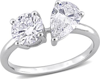 This beautiful two-stone ring is crafted in lustrous 14k white gold and features one round-cut and one pear-cut prong-set lab-created diamonds studded centrally on this sleek band. Enhanced with a polished finish, this lovely ring is a perfect choice for your loved one. Grab this unique ring and watch her eyes sparkle with delight.