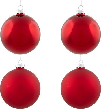 Add festive flair to your holiday decor with this set of glass ball ornaments. Featuring shiny and matte finishes, these vibrant solid red ornaments are perfect for Christmas trees, wreaths, and garlands. Each ornament includes a hanging cord for easy, ready-to-go decorating. Product Features: 4-piece set Color: red Finish: shiny and matte Equipped with gold ornament caps and cords Recommended for indoor use only Dimensions: 4" (100mm) diameter Material(s): glass/metal