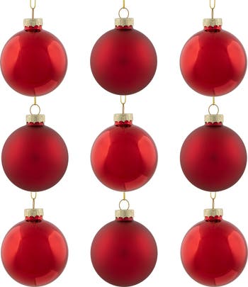 Deck the halls with boughs of holly, because this is the season to be jolly! These glass ball ornaments will allow you to accessorize with a whole new realm of possibility. Offering you a world of creative decor possibilities, they come ready to compliment your home and Christmas decor with ease! Product Features: 9-piece set Color: apple red Finish: shiny and matte Equipped with gold ornament caps and cords Recommended for indoor use only Dimensions: 2.5" (60mm) diameter Material(s): glass/metal