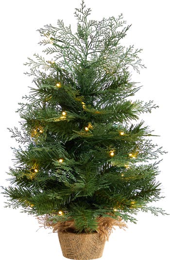 Spread Christmas cheer to compact spaces with this Artificial Christmas Tree. Inspired by nature and crafted from high-quality materials, this mini Christmas tree has lifelike bendable branches, allowing you to shape in your space, and add mini ornaments. To save you time and money, the faux tree comes with 35 warm LED lights for a cozy glow, allowing you to illuminate any space for years to come. Standing 2ft. from a burlap base (included in height) for a rustic touch, add to any desktop. Perfect for a kids' room, office or mantel. Best of all? Zero maintenance! . Faux Christmas Trees are manufactured using synthetic materials, such as polyester material or plastic, and are well designed and constructed to be life-like in appearance. This item will need to be re-shaped when removed from the secure box to allow it to reach its fullest size. Your artificial Christmas Tree will look beautiful for years to come; simply wipe clean with a soft dry cloth when needed.