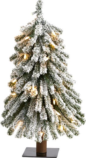 Set up the ultimate Christmas scene even in a limited space environment with the help of this flocked artificial Christmas tree. Completely maintenance-free, this winter-inspired artificial Christmas tree boasts a slim and slender silhouette made up of 111 easy-to-bend branches to showcase all your favorite holiday ornaments and comes beautifully flocked in a winter coating of faux snow to evoke the impression of freshly fallen snow. Arriving pre-strung with 35 clear LED lights to eliminate unsightly tangles and carefully stabilized on a natural trunk and metal stand, this snowy 2' artificial Christmas tree will undoubtedly transform your holiday decor, year after year.