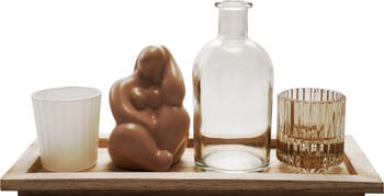 This charming set includes two glass tealight/votive holders, one vase, and one ceramic figure, all beautifully arranged on an 11-inch long length and 4.75-inch wide Paulownia wood tray in natural and multicolor. Perfect for boho, rustic, Scandinavian, farmhouse, or French country-style decor, this set is ideal for creating a cozy, inviting ambiance with candles and decorative accents. Made of durable Paulownia wood, glass, and ceramic, it ensures durability and aesthetic appeal. The varying heights and textures of the pieces add visual interest and dimension to any space, making it a versatile and stylish addition to the home decor. Whether displayed together as a set or scattered throughout a room, this charming set will surely enhance the overall atmosphere with its warm and welcoming design.