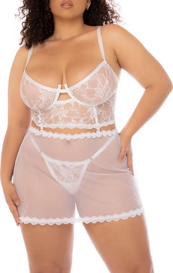 Take your lingerie game to the next level with this mesh set that changes up an underwire bustier to a babydoll chemise with a simple hook closure. It comes complete with a matching thong.