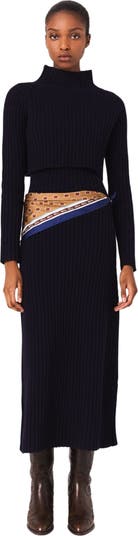 Lines overlap, materials subtly combine. Designed as a complete silhouette, this long dress blends the comfort of ribbed knit with the elegance of layered styling. The 2-in-1 effect creates a graphic contrast between the structured sweater and the fluid skirt.
