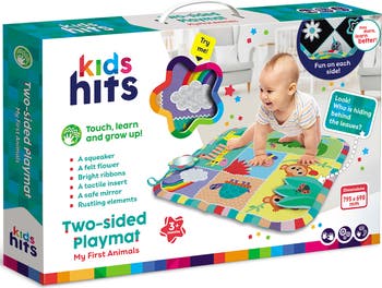 KIDS HITS: TWO-SIDED PLAY MAT: MY FIRST ANIMALS - This two-sided animal-themed baby playmat is a great novelty! 2-IN-1: It’s one side is colorful and bright, and the other one is contrastive black-and-white! This design is created with due consideration of kids’ perception and serves to promote visual stimulation and sensory development in infants. SENSORY FUN: The sun-squeaker, tactile inserts, flap rustling elements, bright ribbons and the soft safe mirror invite babies to make first discoveries of their own. It is so much fun to touch, open and press! Let’s start learning the world! Double the discovery, double the delight! The Kids Hits My First Animals Two-Sided Play Mat is more than just a floor mat — it’s an early learning playground. Specially designed for infants 3 months and up, it combines stimulating textures, interactive sounds, and a baby-safe mirror to keep your little one engaged and smiling. DEVELOPS KEY SKILLS: What makes it truly unique? It’s reversible! One side uses black-and-white contrast to aid early visual development. Flip it over, and your baby enters a colorful zoo adventure full of animals, ribbons, and sensory fun. Tummy time, back time, side rolling — this mat supports it all and grows with your baby's early milestones. Made without batteries or electronics, it’s a peaceful, playful, and practical choice for any parent. INCLUDES: A squeaker, a felt flower, bright ribbons, a tactile insert, a safe mirror, and rustling elements. DIMENSIONS: 31.3 in x 27.6 in (79.5 cm x 70 cm). Play more, learn better!