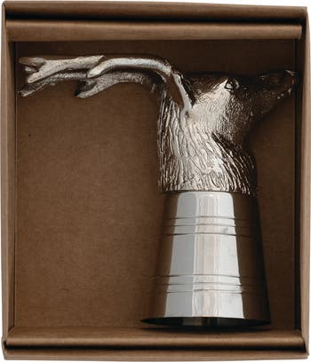 - A distinctive 2-ounce shot glass featuring a cast aluminum and stainless steel construction with an elegant deer head design in a nickel finish