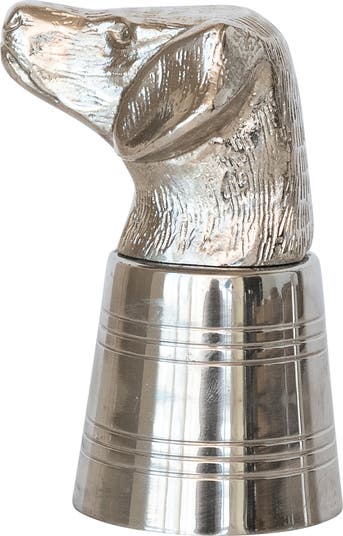 - An elegant dog head jigger crafted from cast aluminum and stainless steel with a sleek nickel finish