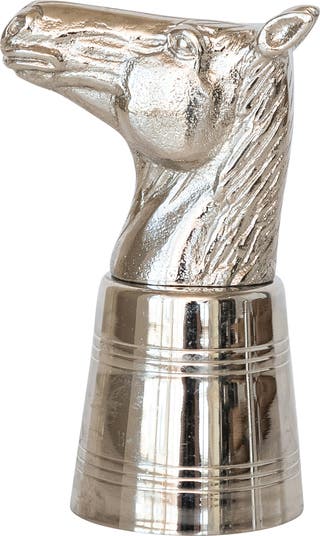 - An elegant horse head jigger crafted from cast aluminum and stainless steel with a sleek nickel finish