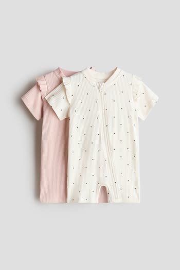 Short sleepsuits in soft, ribbed cotton jersey with frill details. Trimmed V-neck, short sleeves and a zip with an anti-chafe chin guard down the front that continues down one leg.