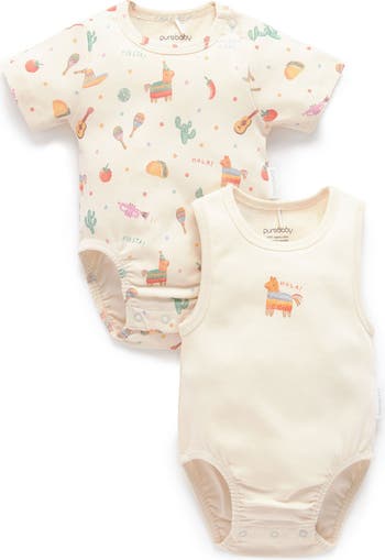 Soft, easy and practical, our 2 Pack Short Ribbed Bodysuit are a lightweight and functional summer wardrobe essential for your little one. Includes one short sleeve bodysuit printed with a fun, all over design and one sleeveless singlet bodysuit with a print at the chest. Made from soft 100% Cotton, these bodysuits are perfect for everyday layering throughout the seasons and are super soft on delicate skin. Available in 3 fun prints.
