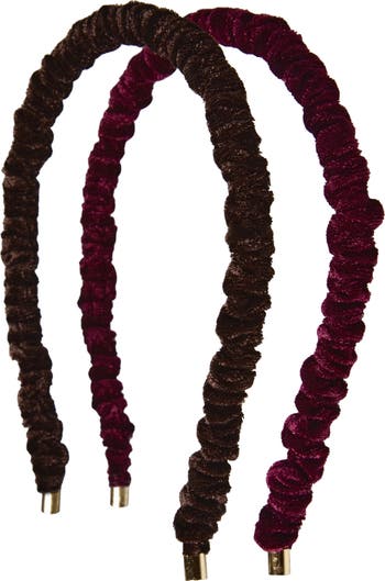 Add subtle texture and polish to your outfits with this set of ruched velvet skinny headbands, one in rich burgundy and the other in warm brown.
