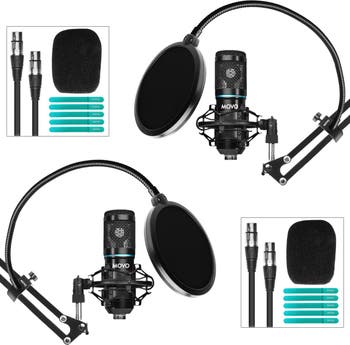 The Movo 2-Pack Universal Cardioid Condenser Microphone Kit has everything you need to capture exceptional sound in one convenient package. With two of each item, this bundle was made for the creative duo. Movo PC-M6 Condenser Microphones feature cardioid polar patterns, which capture audio from what you put in front of it and ignores everything else, significantly cutting down on background noise and time spent editing. Find the perfect height for your microphone with the adjustable ASM-5 microphone stands. These 30" long scissor arm stands are collapsible and fold easily, ideal for transporting. They attach directly to your table, desktop, or surface with the included 2 1/4" clamps, leaving more room for you, your friends, and other gear. Remove unwanted noise and audio pop twice as a effectively with the dual-layer mesh PF-6 pop filters, so that the focus of your recording will be the excellent vocal sound quality. The filters' flexible gooseneck arms can be adjusted seamlessly to suit your audio needs. Use the included shock mounts to isolate your microphones from mechanically transmitted noise and capture studio quality audio where ever you are.Spend less time building the perfect recording kit and more time creating your content with this Movo 2-Pack Microphone and Equipment Bundle. Pick a partner and produce great content together.