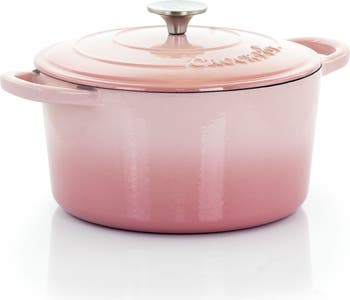 The Crock-Pot Artisan 2 Piece 5 Quarts Enameled Cast Iron Dutch Oven is ideal for delicious dinners for any occasion. This cookware's self-basting lid creates a continuous basting environment for more flavorful meals. It distributes and retains heat evenly and allows for a multitude of cooking techniques. The oversized handles and stainless steel knob provides a sturdy grip for easy handling and carrying. This cooking pot is perfectly suitable for a large array of dishes such as baked potato soup, spiced rice, and warm curry for the family to enjoy!