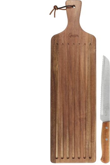 Serve up your favorite fresh breads with this serving board and bread knife set. This visually stunning arrangement is perfect for grazing and gatherings, staged on a solid wood board as a nod to artisanal craftsmanship. Long 20.3 x 5.5in board features a handle for easy transport and a hanging loop for storage options. Seven slicing grooves adorn this serving board, making it easy to cut your breads into perfectly even pieces and serve all in one place. Stainless steel partial tang bread knife is constructed of stainless steel and a double riveted wooden handle for style and quality. Hand wash only.