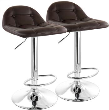 Add a stylish touch to your home bar or kitchen counters with the Elama 2 Piece Tufted Faux Leather Adjustable Bar Stool in dark brown with chrome base. Constructed with quality metal and faux leather for long lasting use. This bar stool set features adjustable height with a foot rest for comfort at all heights, and a swivel pedestal base for full range mobility. Tufted seat design with button details for style in addition to function.