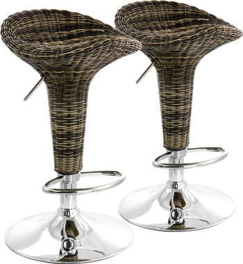 Add a stylish touch to your home bar or kitchen counters with the Elama 2 Piece Adjustable Rattan Bar Stools. This set of stools is crafted with quality metal and durable woven plastic for long lasting use. Bring a fun and casual look into your home decor with the wicker detailing. Adjustable swivel base features a foot rest for customizable height and added support. Backless chair design with saddle seat style is casual and comfortable. Arm-less design allows you to easily place stools side by side without worrying about wasted space.
