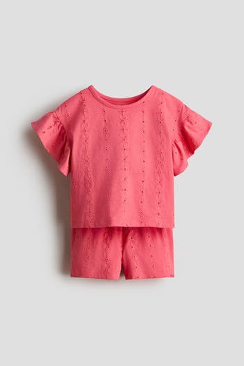 Set with a top and matching pair of shorts in soft cotton jersey with broderie anglaise. Top with a narrow trim around the neckline, dropped shoulders and flutter sleeves. Shorts with an elasticated paper bag waist.