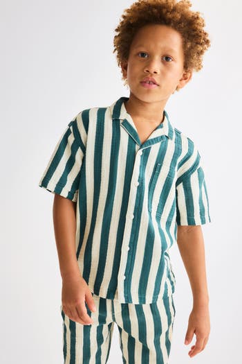 Set in soft cotton muslin with a resort shirt and matching shorts. Short-sleeved shirt with a resort collar, buttons at front, and a patch chest pocket. Knee-length shorts with adjustable elastic at waistband, mock fly, diagonal side pockets, and an open back pocket.