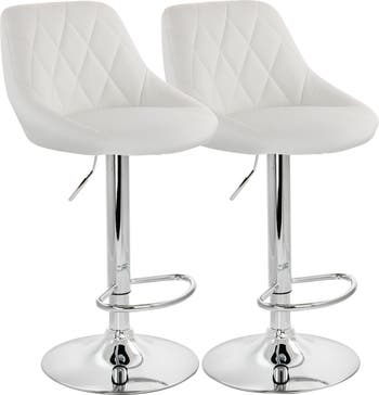 Add a stylish touch to your home bar or kitchen counters with the Elama 2 Piece Diamond Stitched Faux Leather Bar Stool in White with Chrome Base. This set of chairs is uniquely shaped to form to your lower back while seated. Swivel base is perfect for movability and adjustable height allows you to customize these stools to whatever height is most comfortable and convenient for your home counters. No arms allow you to seat the stools next to each other without worrying about lack of space. These adjustable chairs are crafted from quality metal and faux leather for a strong and long lasting design.