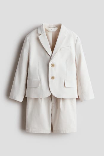 Set with a blazer and pair of shorts in a soft cotton weave. Single-breasted blazer with notch lapels, a welt chest pocket, jetted front pockets with a flap and decorative buttons at the cuffs. Lined. Shorts with an adjustable, elasticated waist and a zip fly with a button. Diagonal side pockets, a welt back pocket and pleats at the front.